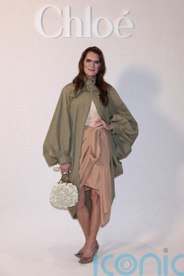Brooke Shields chose a polished Chloé ensemble, stepping out in a balloon-sleeved khaki coat over a ruched skirt that echoed the house’s relaxed elegance.