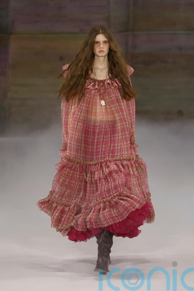 Plaid appeared again in softer pink tones, where a loose, flowing dress drifted across the runway in airy layers.
