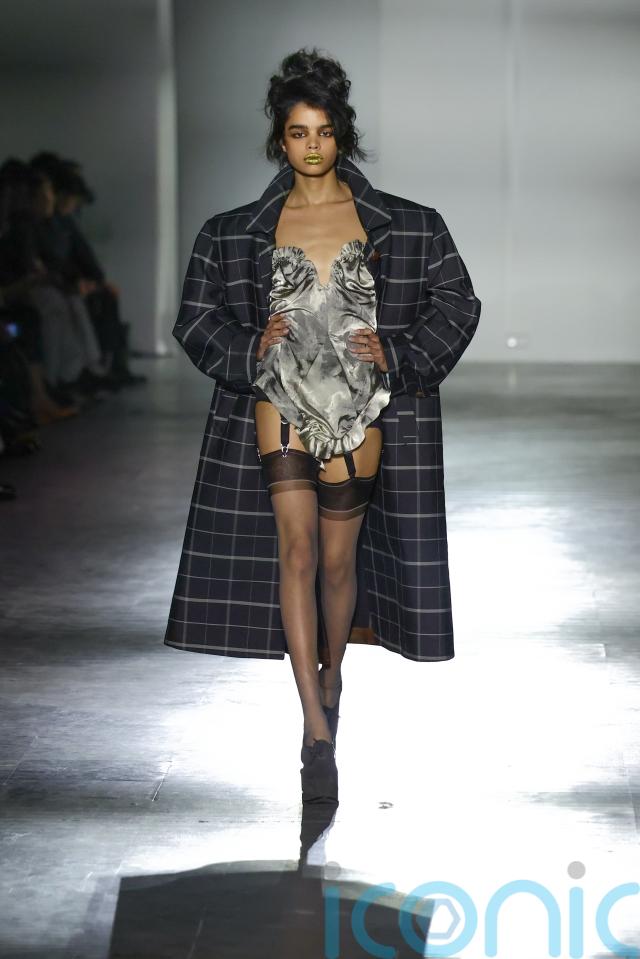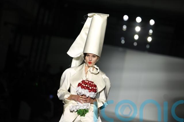 One look featured an oversized coiled headpiece wrapped around the model’s head like a sculptural halo, highlighting the London label’s reputation for bold and eccentric styling.