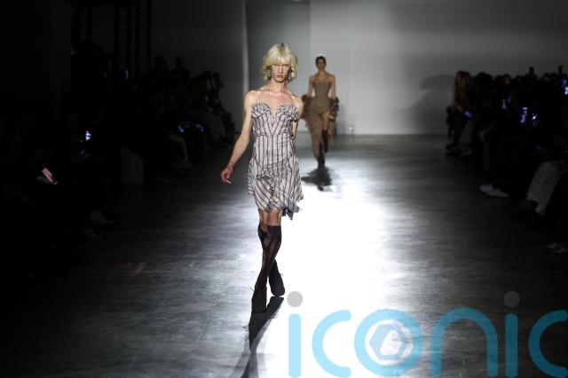 Male models appeared in suspenders, heels and short skirts, while tailoring was worn across genders in ways that blurred conventional masculine and feminine dress codes.
