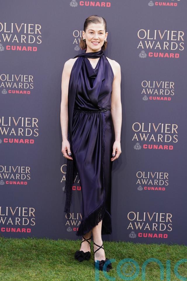 Rosamund Pike, who won best actress for her role in Inter Alia, embraced the scarf dress trend in a midnight-blue silk dress by Christian Dior, featuring a draped V-neckline and fringed hem.