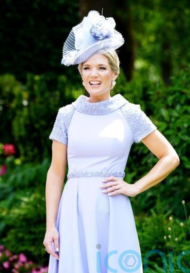 Good Morning Britain’s Charlotte Hawkins is all pale blue and beads, sporting a slightly smaller hat with intricate netting and floral details.