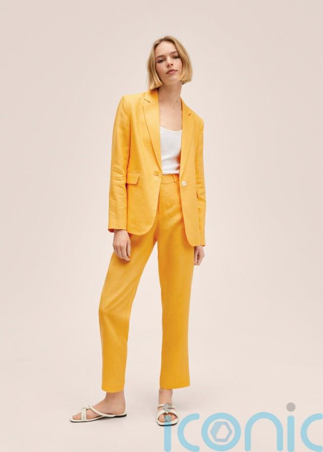 Mango Blazer Suit 100% Linen, £29.99 (was £59.99); Ribbed Cotton-Blend Top, £9.99 (was £12.99); 100% Linen Suit Trousers, £19.99 (were £35.99); Padded Sandals, £22.99