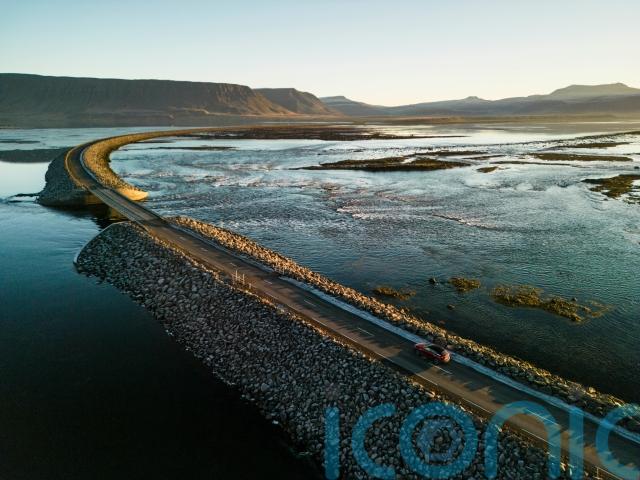 We’ve got a flight to catch so our stopping time has to be kept to a minimum. But as we cut across from the village of Hólmavík across the mountains on Road 61 to Road 60 – there’s a lot to be said for Iceland’s logically named routes – we have to make a stop on the incredible link road across the Gilsfjörður fjord. It stretches for more than a mile to connect two pieces of land, and offers remarkable panoramic views. With a brisk easterly wind, you can’t stand in it for long without needing to jump back to the car; the MX-30’s Iceland-ready heated seats quickly get us back up to temperature again.