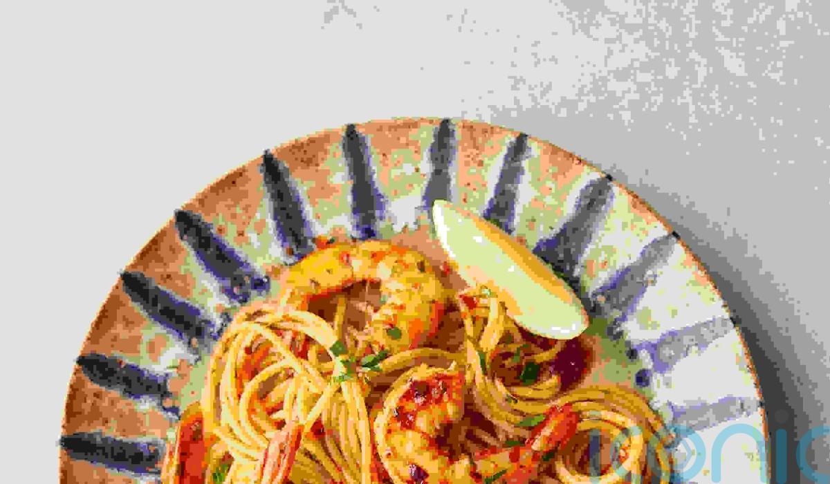 5. Using tongs, drag the pasta into the pan, squeeze in half the lemon juice, throw in the parsley leaves, then toss together, loosening with a splash of starchy cooking water, if needed. To serve, pick out and discard the crispy prawn heads and cut the remaining lemon half into wedges for squeezing over.