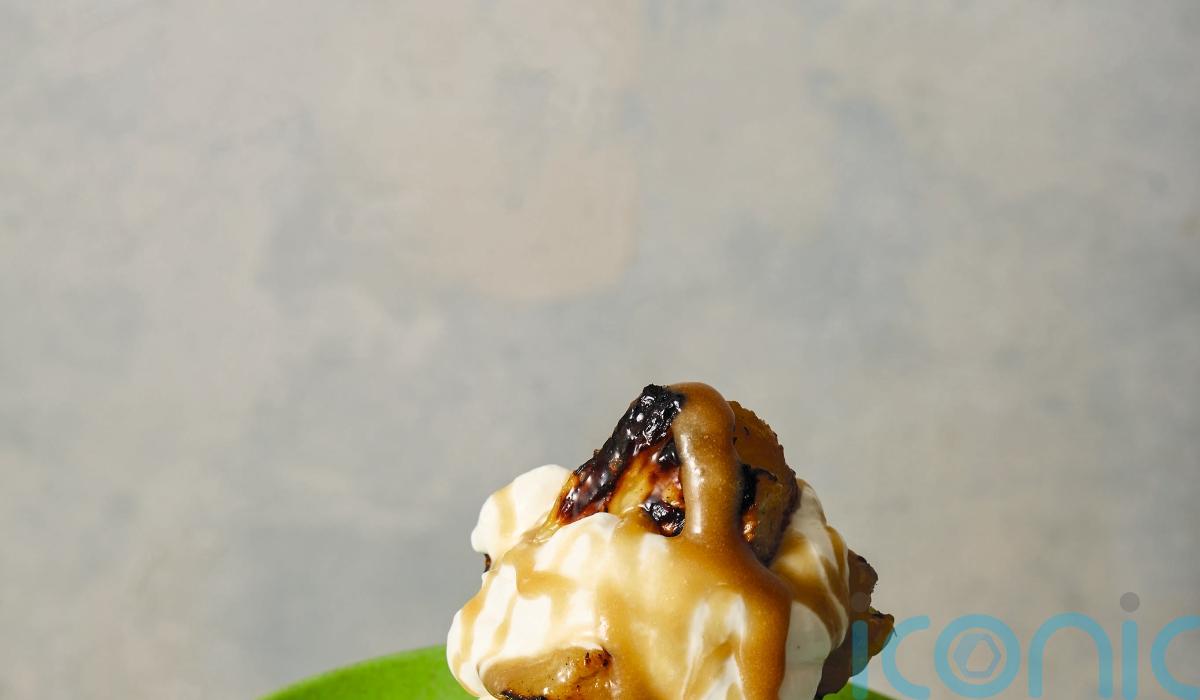 8. Serve the crumpets topped with a scoop of ice cream, the pineapple, the caramel sauce and a dollop of the cream.