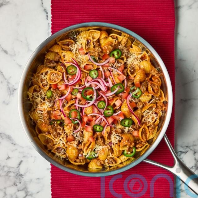 5. Once fragrant, add your conchiglie with your beef stock mix and 500 millilitres boiled water and bring to the boil. Once boiling, reduce the heat to medium and cook, covered, for 11 to 14 minutes, or until the mince is cooked through (no pink meat!) and the pasta is cooked with a slight bite – this is your taco-spiced pasta. Tip: Stir occasionally to stop it from sticking!