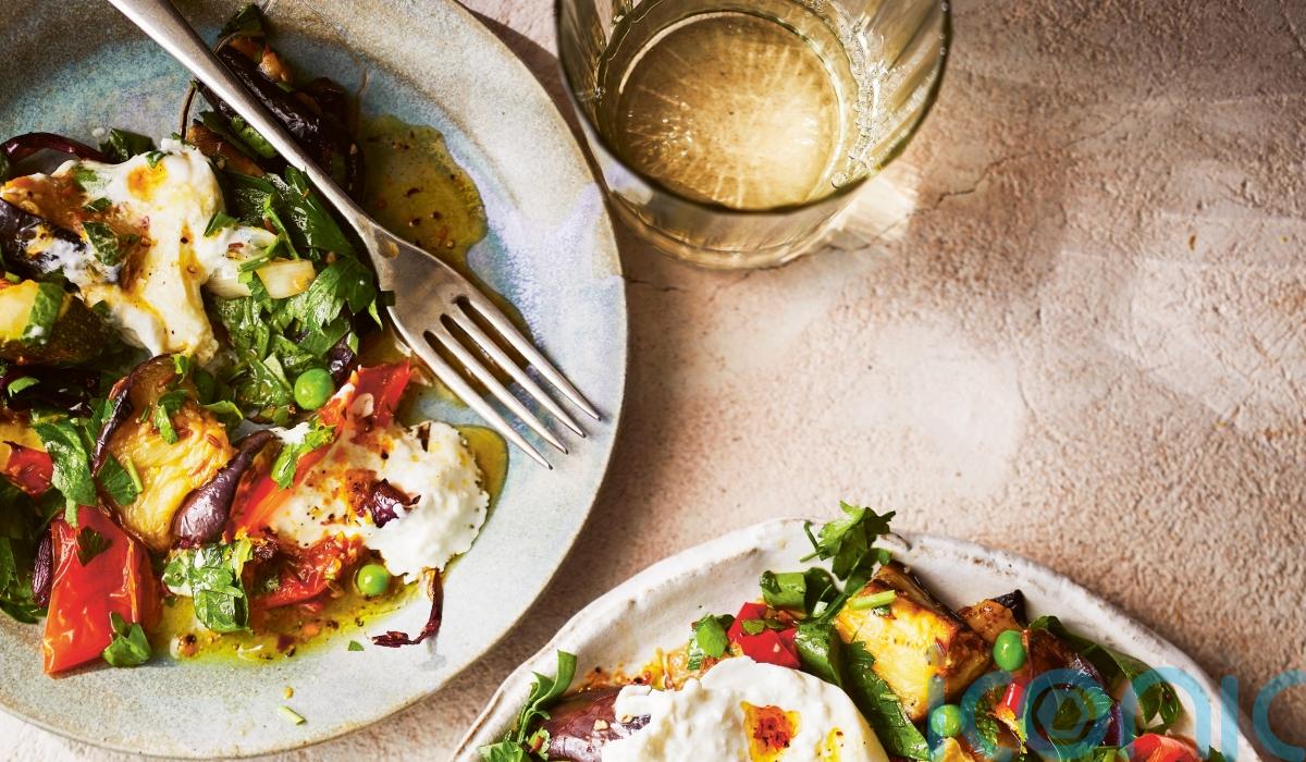 3. Spread out the vegetables on the prepared baking tray and roast for 25–30 minutes until the vegetables have blistered and softened but are still a little al dente. Add the thawed peas to the baking tray and set aside so the veg can cool.