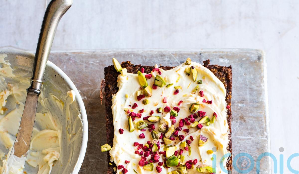 5. To make the topping, mix the remaining orange zest with the cream cheese, honey and lemon zest in a small bowl. Spread it on to the cooled cake, then sprinkle the remaining chopped pistachios and dried raspberries on top.