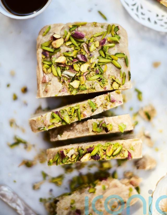 1. Grease a loaf tin with a little oil then line it with cling-film, leaving some overhanging the edges of the tin. Roughly chop the pistachios. Remove the cardamom seeds from the pods, discard the pods and grind the seeds until fine. Add to a large mixing bowl with 30g of the chopped pistachios, the tahini, vanilla and sea salt and beat until smooth.