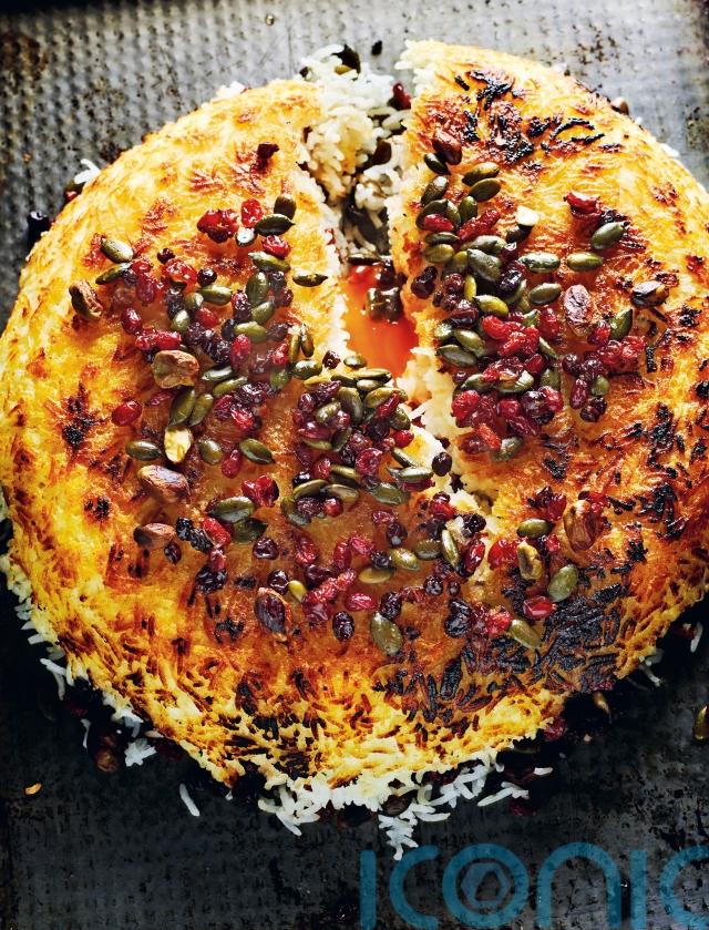 5. Just before serving, dig up a small well in the top of the rice and gently add the egg yolks. Cover the yolks with the rice and, using a plate where the lid once was, invert the rice carefully on to a plate. Serve immediately with the rest of the pumpkin seeds, pistachios, raisins and barberries scattered over the top.