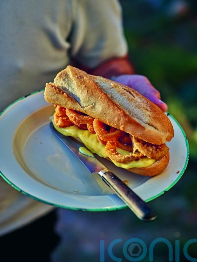 3. Working in batches, fry the squid for around three minutes or until golden and crunchy, then remove from the oil and set aside to drain on a plate lined with paper towels. Sprinkle with salt as soon as you remove it from the oil, then continue with the next batch. Lightly toast the baguette slices, then assemble the sandwiches by spreading the aioli over four of the slices, then adding the fried calamari. Top each one with the remaining baguette slices and enjoy.