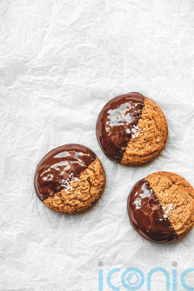 4. To serve, dip the cookies halfway into the melted chocolate and then place back on the lined tray. Refrigerate until the chocolate has set. If stored in a sealed container, these cookies will keep for four to five days.