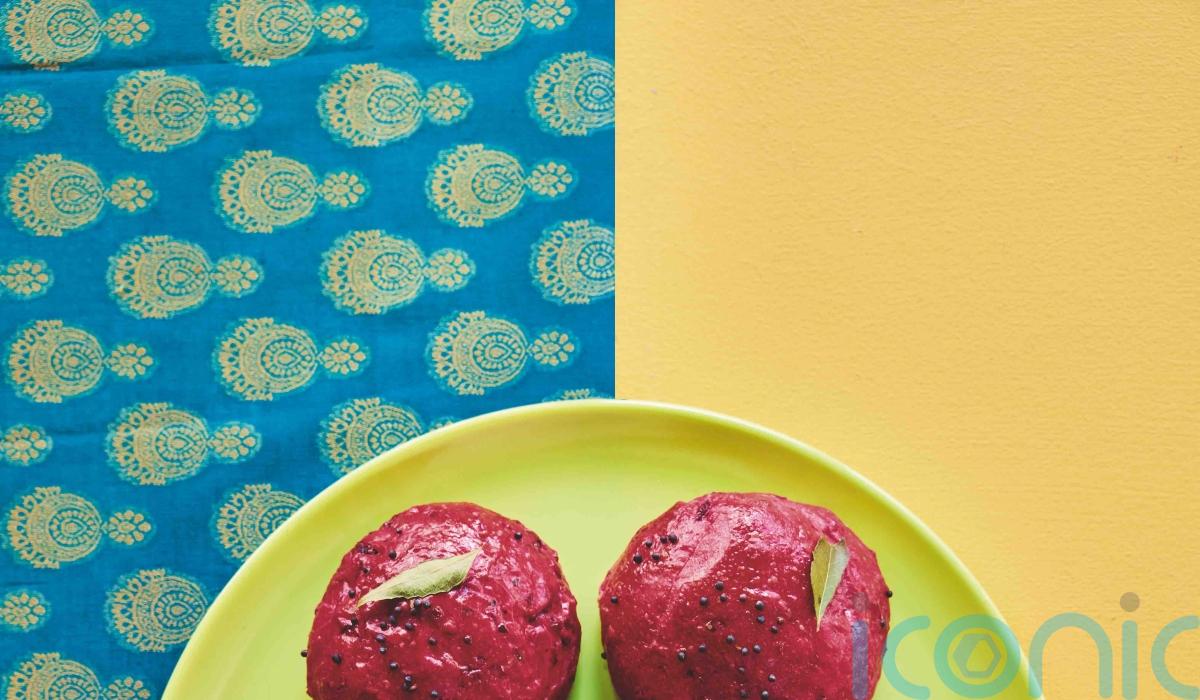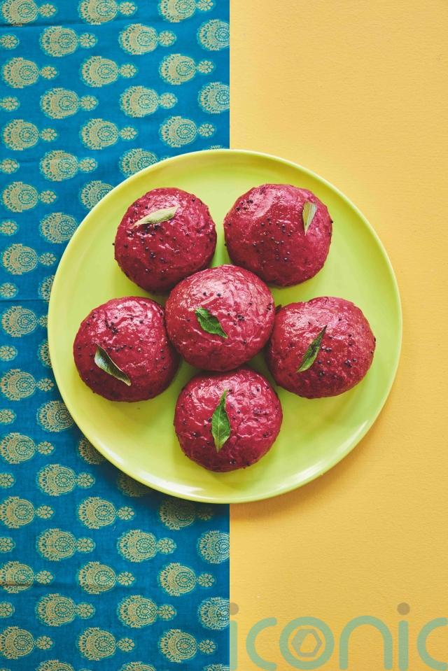 “Curry leaves, mustard seeds and ginger are a classic seasoning combination in South India, so I decided to use them as a flavouring for these vibrantly pink buns,” says Rukmini Iyer, who wanted to create something carby but “hands off” to bake for an Indian brunch.