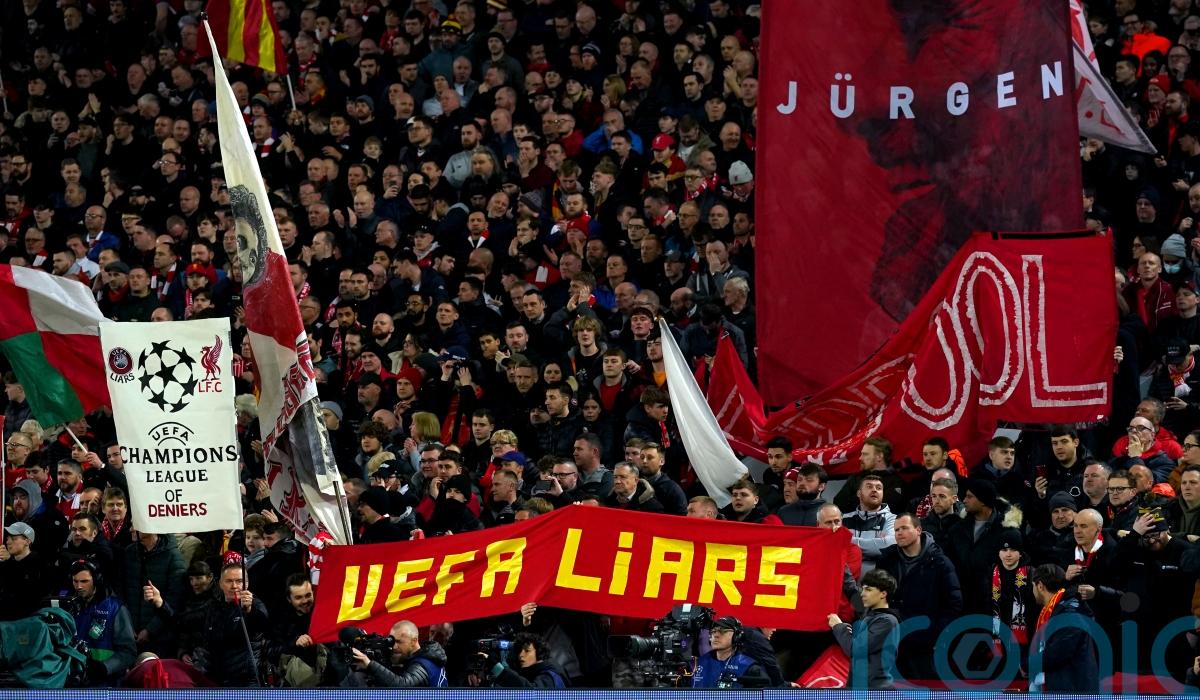 Liverpool fans made their anger with UEFA clear as they booed the Champions League anthem ahead of Tuesday night’s clash with Real Madrid at Anfield.