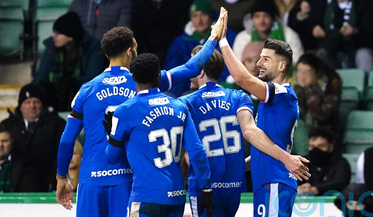 Rangers’ third goal was a gift. A poor clearance from Marshall was returned by midfielder Ryan Jack to Sakala who turned past defender Will Fish and slotted past the Hibs keeper from 16 yards.
