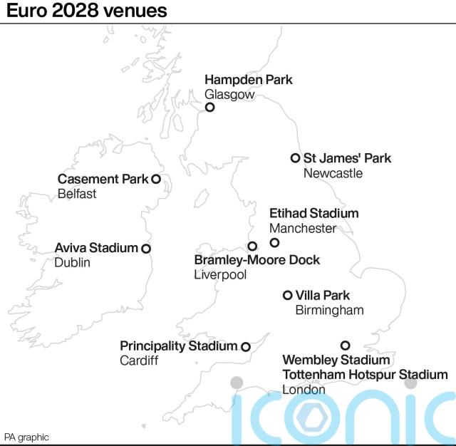Cardiff’s Principality Stadium, Hampden Park in Glasgow, Dublin’s Aviva Stadium and a redeveloped Casement Park in Belfast will also host matches.