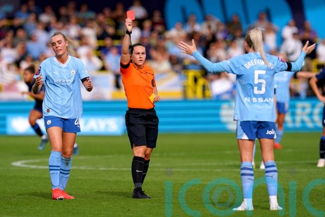 City looked the brighter side and had taken a 1-0 lead via Chloe Kelly’s deflected seventh-minute strike, but late in the first half referee Emily Heaslip decided Alex Greenwood had been time-wasting after taking 26 seconds to take a free-kick and dismissed the bewildered captain with a second yellow.