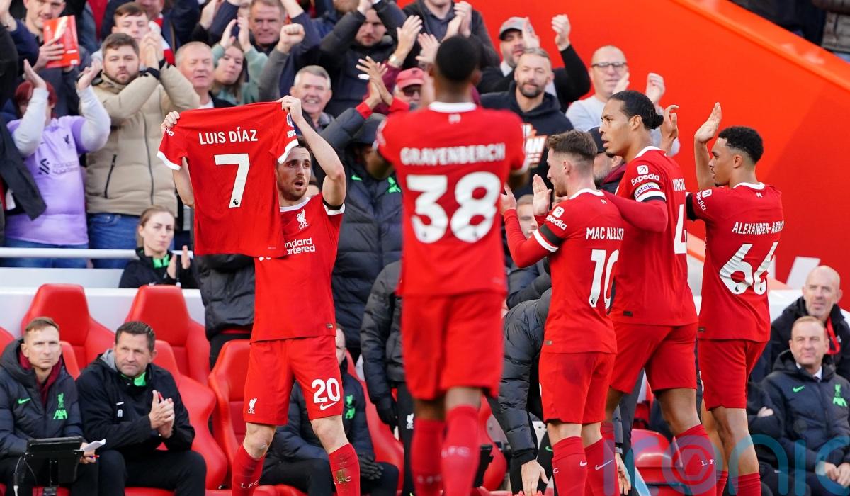 Jota held aloft Diaz’s number seven shirt after scoring, with the Colombian not featuring in Liverpool’s squad following reports his parents had been kidnapped in his homeland.