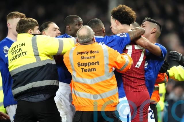 Abdoulaye Doucoure and Curtis Jones of Liverpool also saw red after the final whistle, with the Everton man’s celebrations in front of Reds fans kicking off a melee.