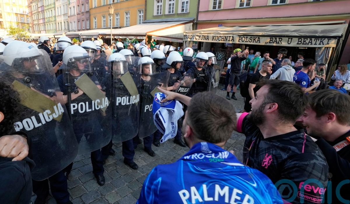 A water cannon was used by police after trouble broke out ahead of Chelsea’s Conference League final against Real Betis in Wroclaw.