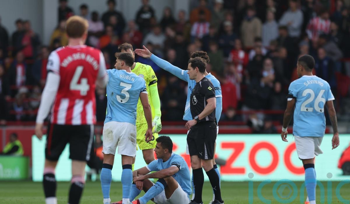 Rodri was forced off after 22 minutes of City’s 1-0 win at the Gtech Community Stadium having clutched his hamstring after stretching for a ball, with City continuing to assess the full extent of the injury.