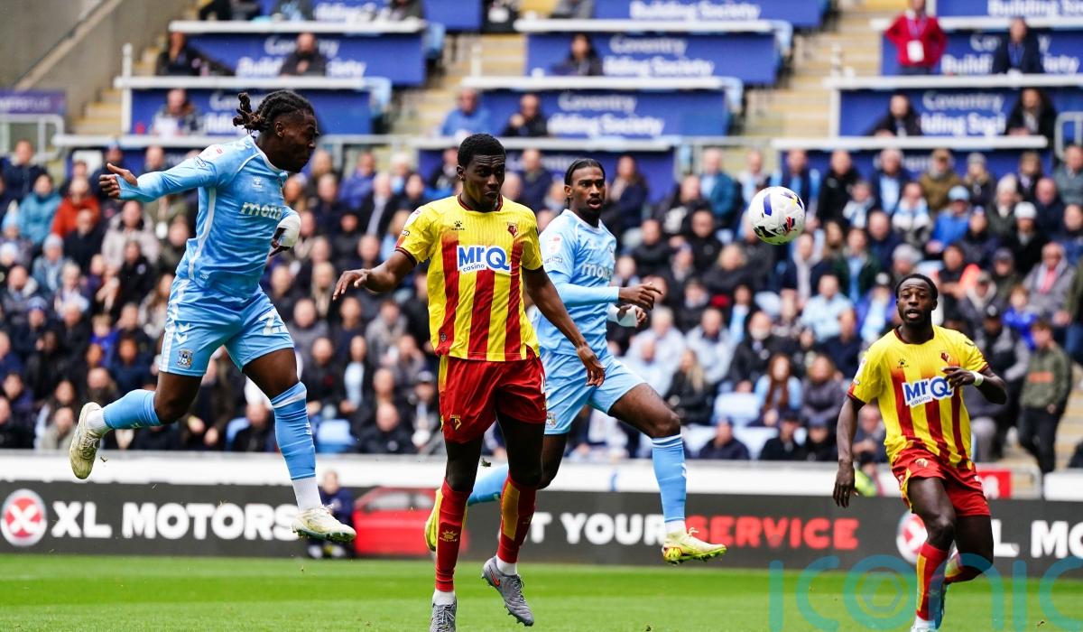 League leaders Coventry recorded their sixth win in a row with a 3-1 victory over 10-man Watford.