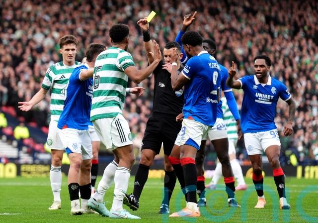 There was plenty to keep referee Nick Walsh and video assistant Steven McLean busy. Nico Raskin’s own goal was disallowed following a VAR check which concluded Daizen Maeda’s heel was offside. Derek Cornelius was perhaps fortunate to escape with a yellow card following a flying tackle on Kenny before Thelo Aasgaard received a red card for a challenge that ripped Anthony Ralston’s shorts and upper thigh. Auston Trusty was fortunate not to join Aasgaard after kicking Rangers goalkeeper Jack Butland in the face. Rangers fans also wanted the teams evened up when Maeda caught Mohamed Diomande in the chest with his boot and when the referee penalised the already-booked Ralston for handball in the box after he stopped a shot with his elbow. Walsh handed out nine yellow cards in all, six to Celtic.