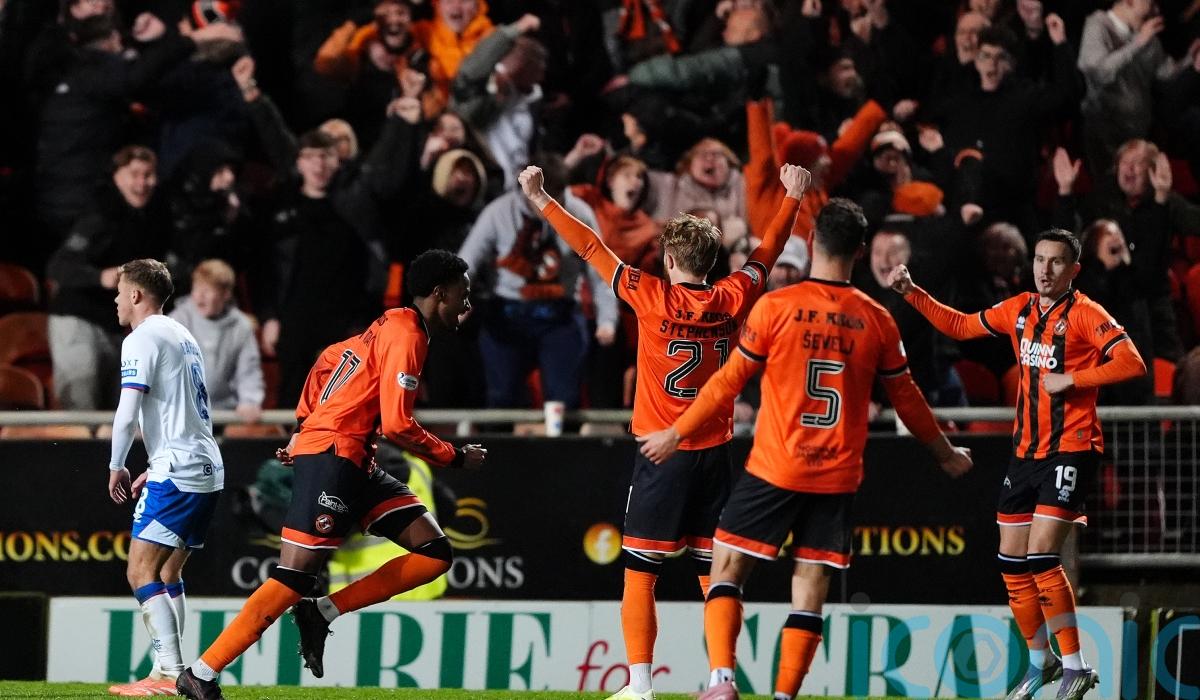 Amar Fatah restored United’s lead in the 66th minute with a fine finish but in the sixth of six added minutes Gers substitute Max Aarons was brought down in the box by Will Ferry and Bajrami fired the spot kick high into the net.