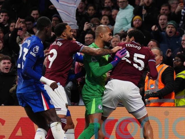 West Ham’s afternoon was compounded when Jean-Clair Todibo was dismissed in stoppage time for violent conduct after grabbing the Pedro’s throat.