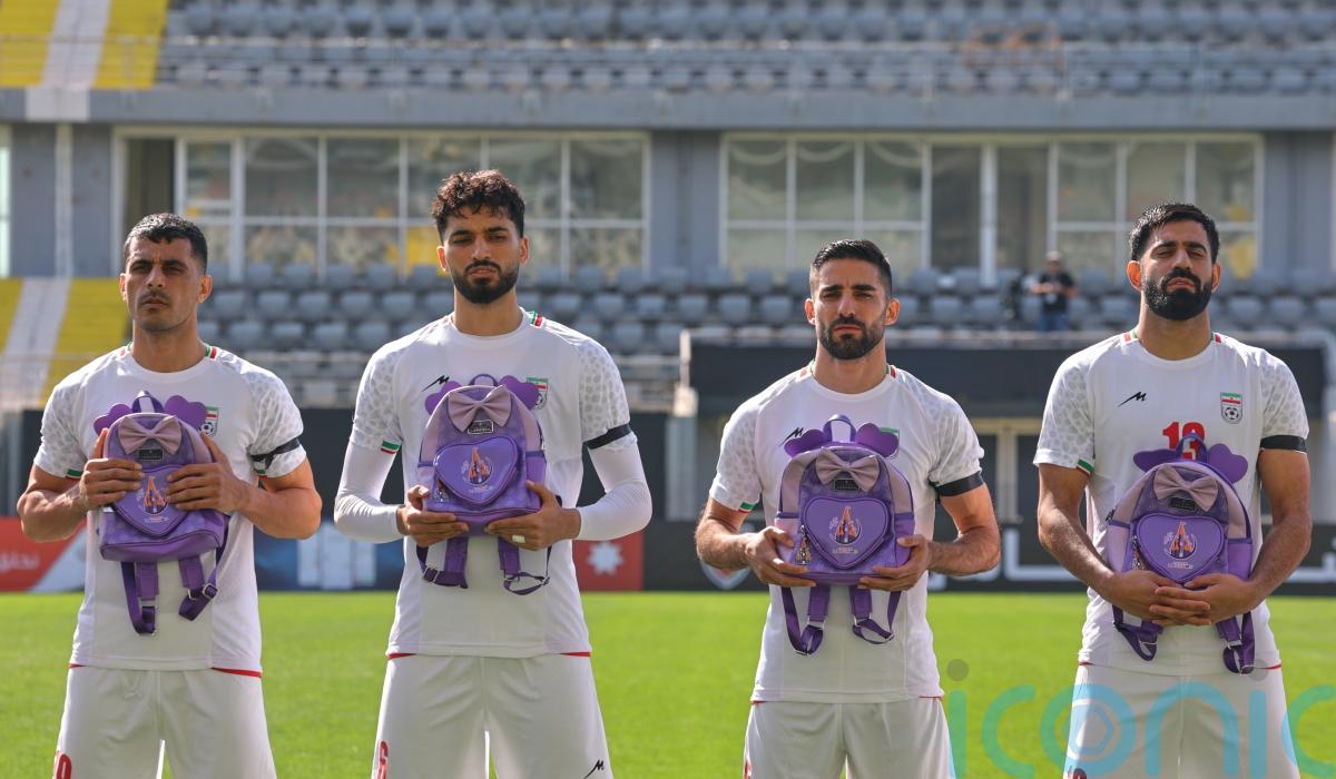 Iran wear black armbands and hold schoolbags during national anthem before match