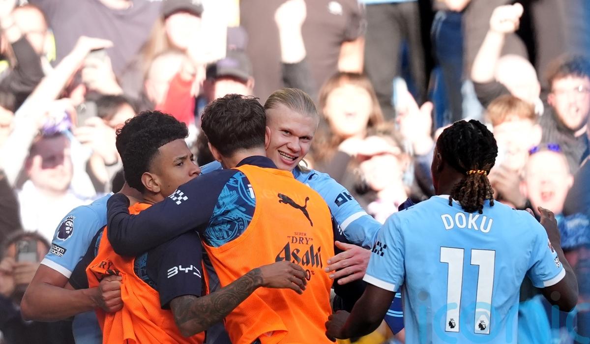 The game swung from end to end and City reclaimed the lead as they attacked down the left and Nico O’Reilly’s cross was helped on by Rodri and Haaland swivelled inside the area to score.