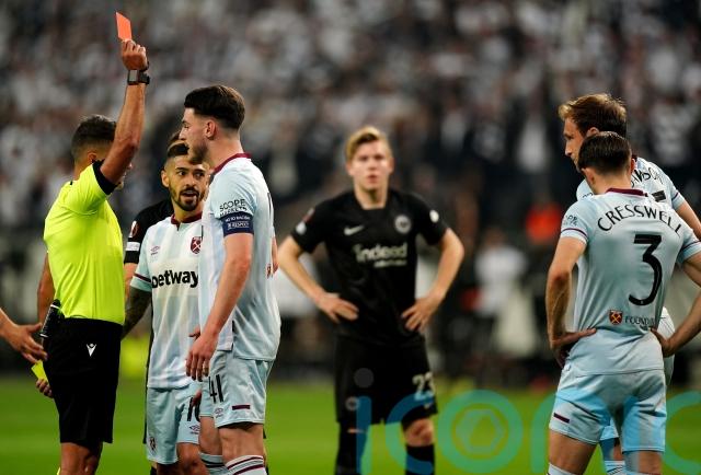 West Ham’s uplifting European adventure ultimately ended on a sour note after manager David Moyes was sent from the touchline for angrily booting the ball back towards a ball boy who had retrieved it.