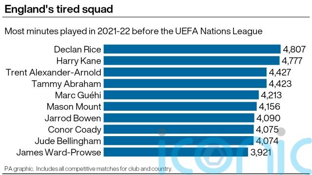 Eighteen members of Southgate’s 27-man squad had accumulated at least 3,420 minutes of playing time during the 2021-22 campaign – equivalent to a full 38-game season – before joining up with England.