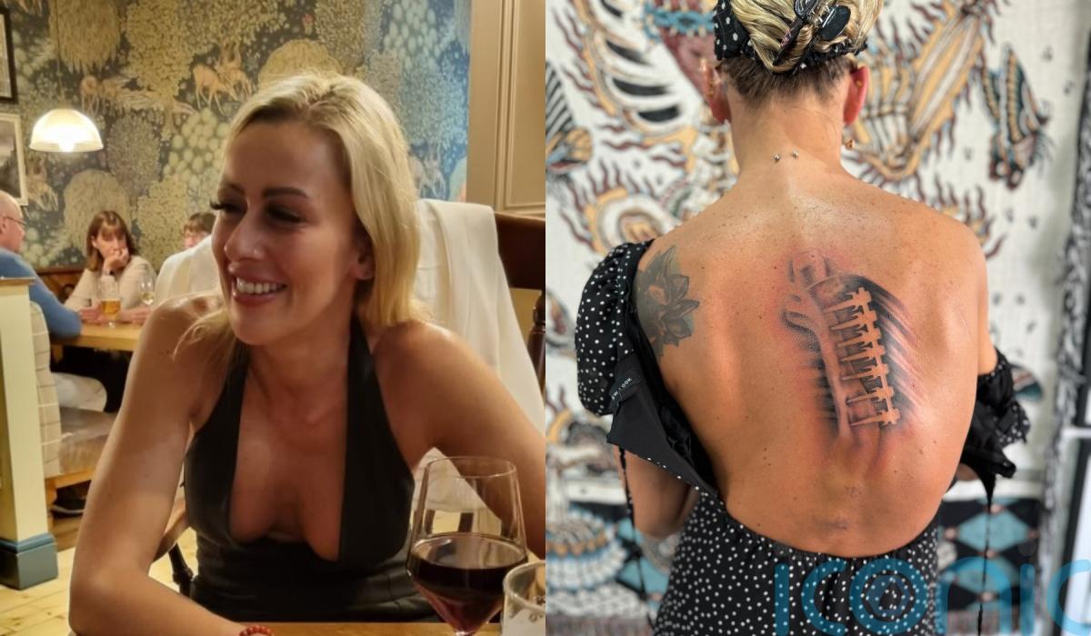 A fitness instructor “severely deformed” by scoliosis has raised £500 to get a tattoo on her back of the metalwork in her collapsing spine and “stop the bullying” she endures.