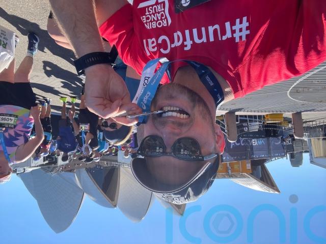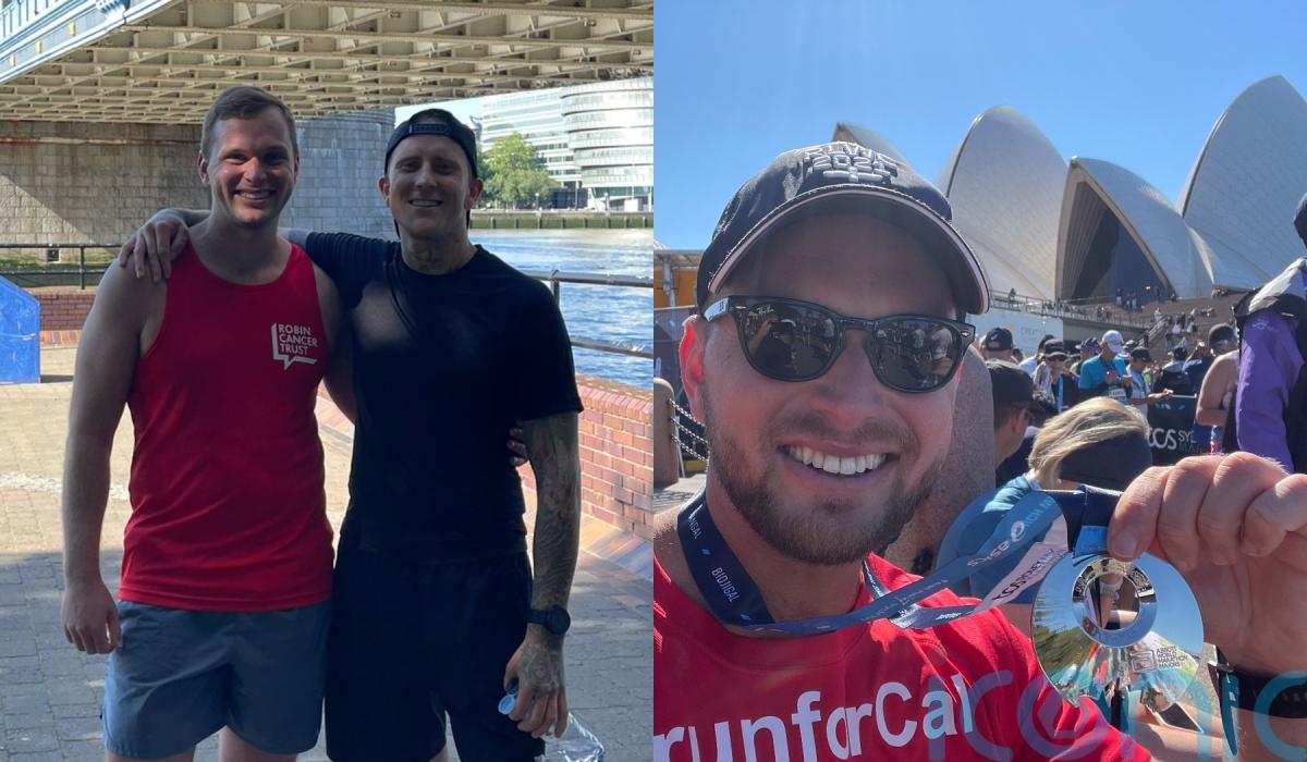 A man who discovered he had testicular cancer at 22 after finding a lump in the bath is fulfilling his dream of travelling in Australia after running the Sydney Marathon in honour of his friend who lost his battle with the same illness.