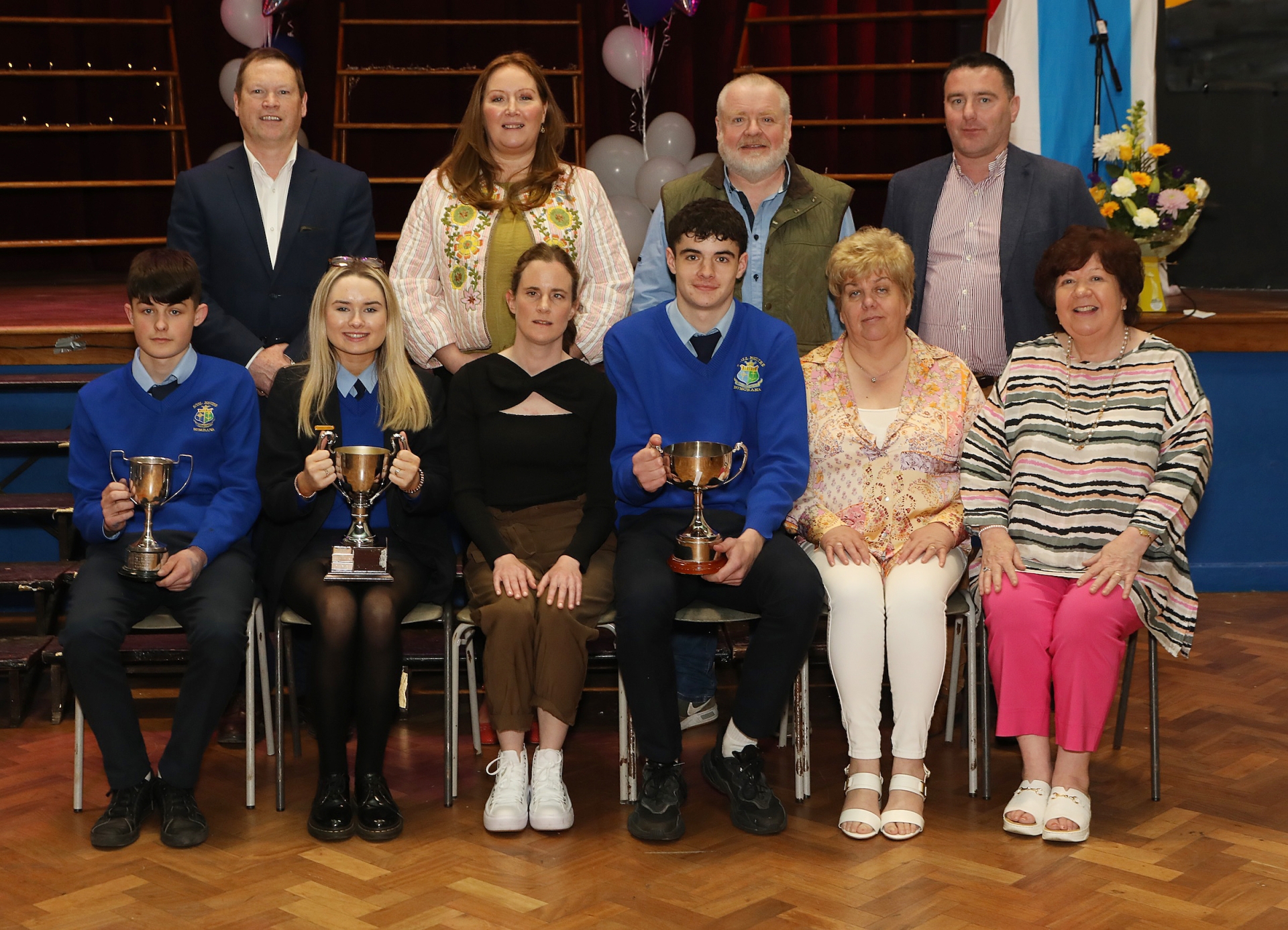 TY Students of the Year, Sean McLaughlin and Leahrose Davis, LCA Student of the Year Rory Green at the Scoil Mhuire Junior Prize-Giving 2023. Included are Jennifer Doherty, guest speaker, Rosaleen Grant, principal, and Cathal Davis, vice-principal.