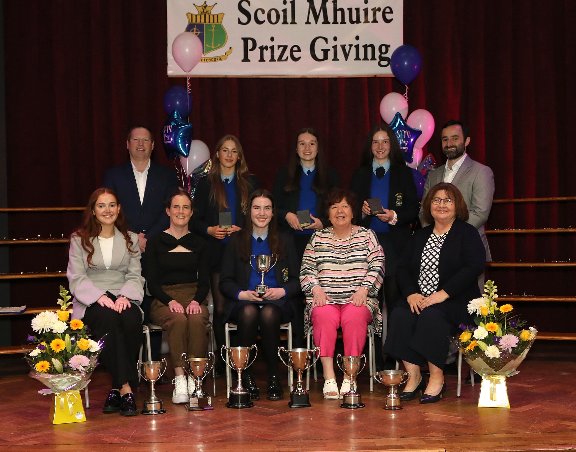 Junior student of the Year Aoibhin Doherty with Miss Shannon McLaughlin, teacher, Jennifer Doherty, special guest, and right, Lorna Barron, vice-principal, and Rosaleen Grant, principal. Standing, from left, Cathal Davis, vice-principal, Ava Callaghan, Lucia Clifford, Olivia Spring-Fegan, and Micheal Clancy, teacher.