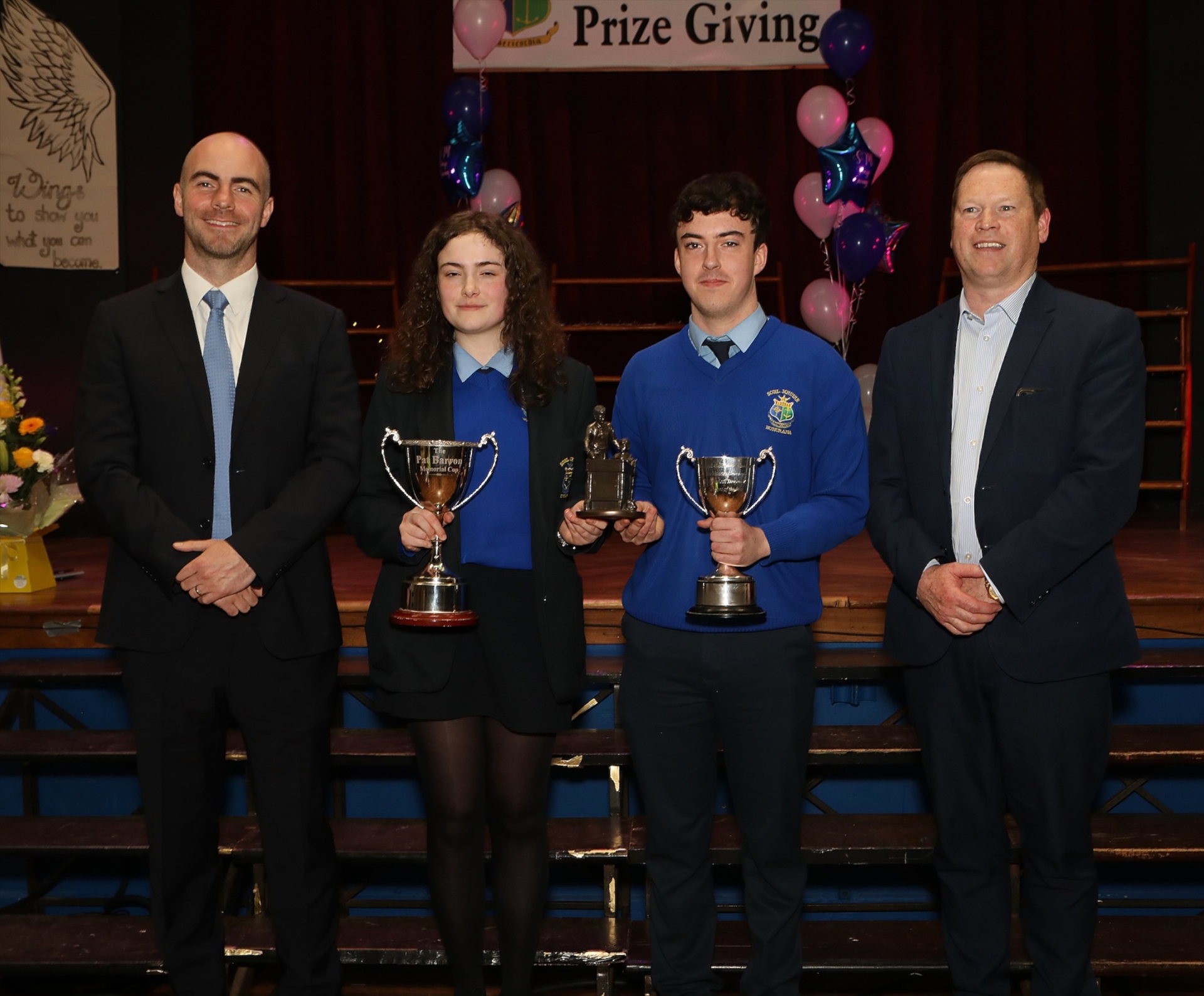 Sarah Bradley winner of the Pat Barron Memorial Cup as 5th Yr Student of the Year and Eoin Mulhern who won the Mother Benignus DCG Award at the Scoil Mhuire Senior Prize-Giving 2023