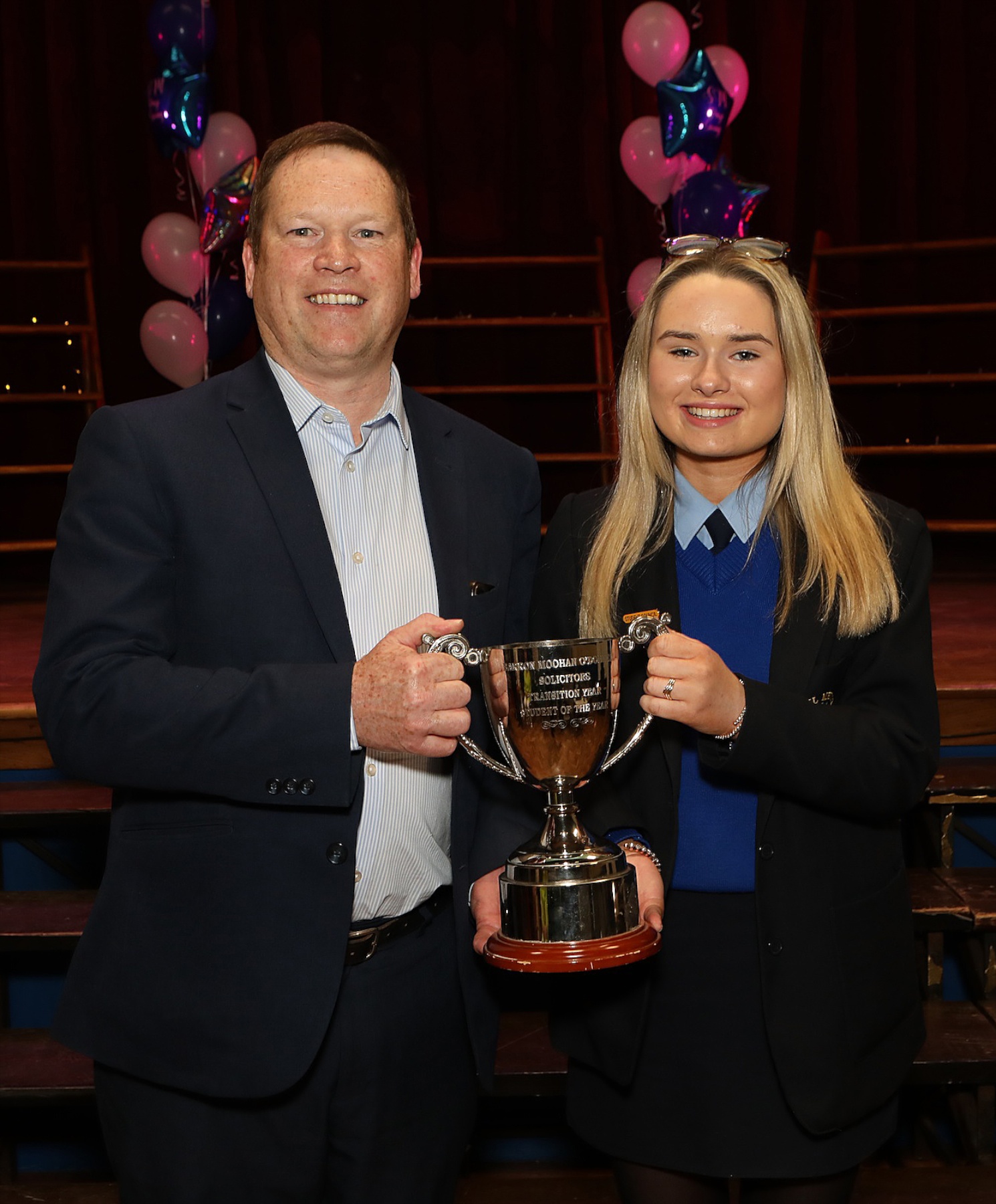 Deputy Principal Mr Cathal Davis presenting the Barron O’ Donnell Cup for TY Student of the Year to his daughter, Leahrose Davis.
