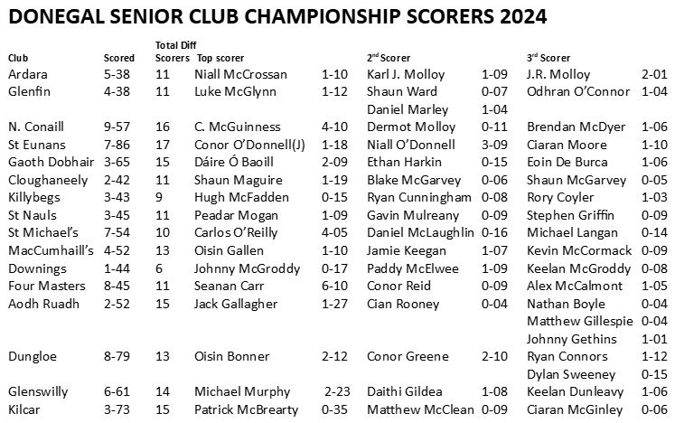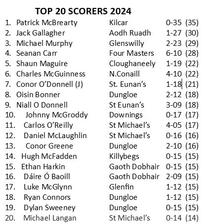 Once again county goalkeeper Gavin Mulreany was tops in the goalies stakes with 0-09 but pushed hard by Dungloe’s Danny Rodgers who registered 0-06 with Daithi Roberts scoring 0-01. Only half the total who ventured up field to score the previous year did so in 2024.