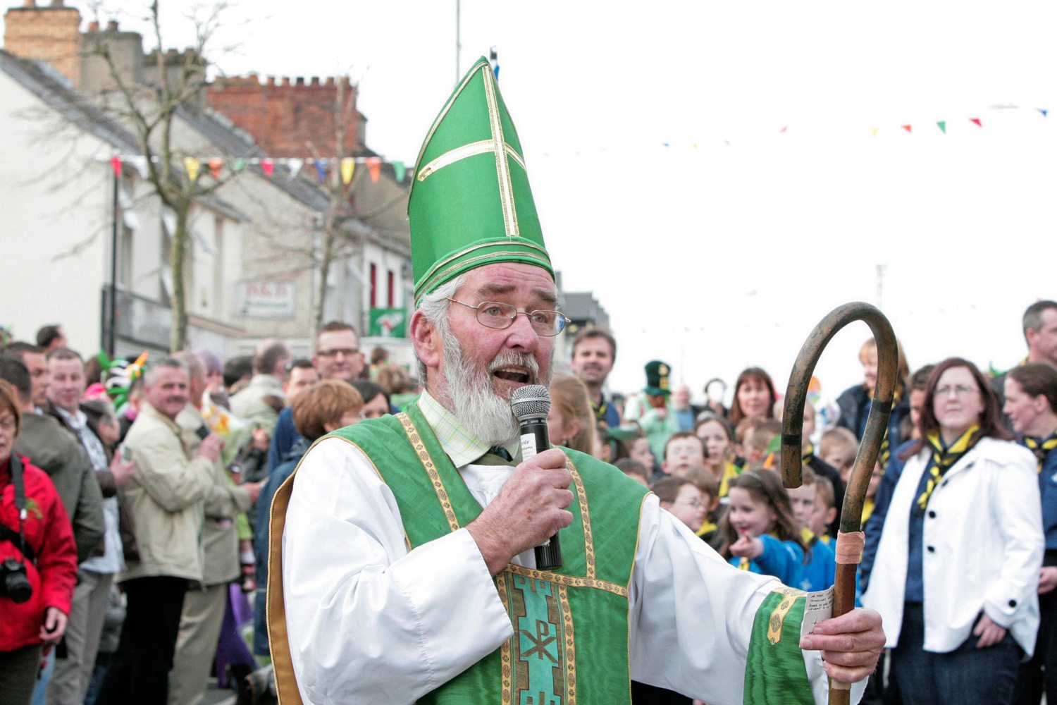St Patrick (Peter Gurrie) addressing the viewing stand in Irish, Polish, and English.