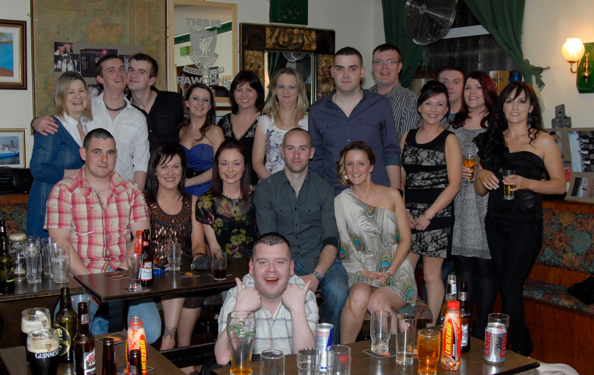 Michael and Caroline with friends, family and their bridal party at their first wedding anniversary celebrations at Rawdon's Bar in Moville.