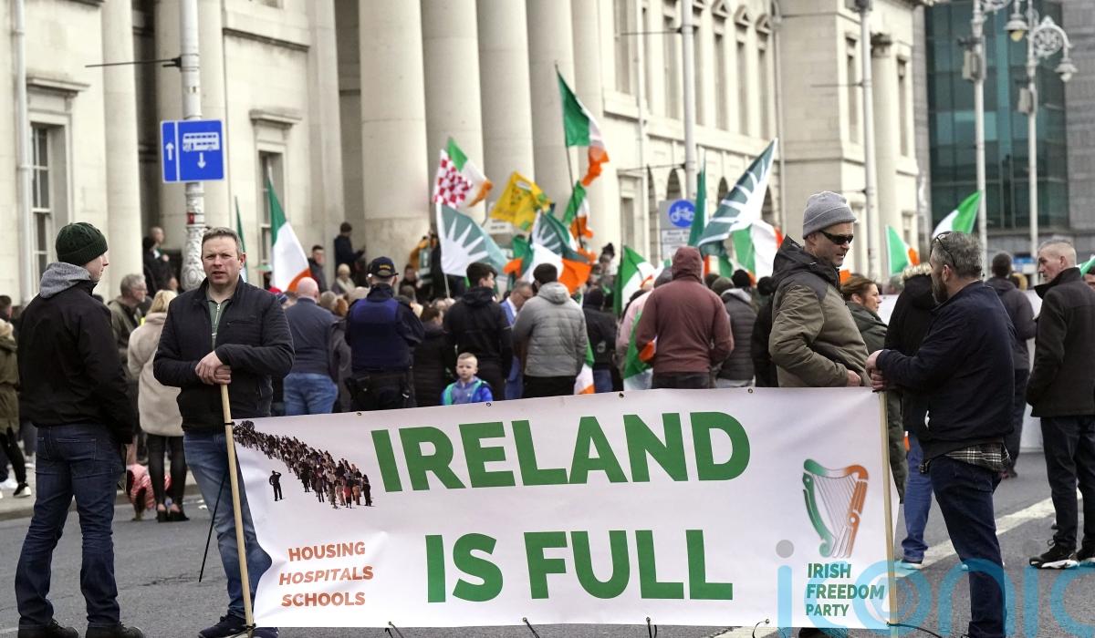 Some protesters carried Irish flags, as well as signs and banners with slogans such as “Ireland is full” and “Irish Lives Matter”.