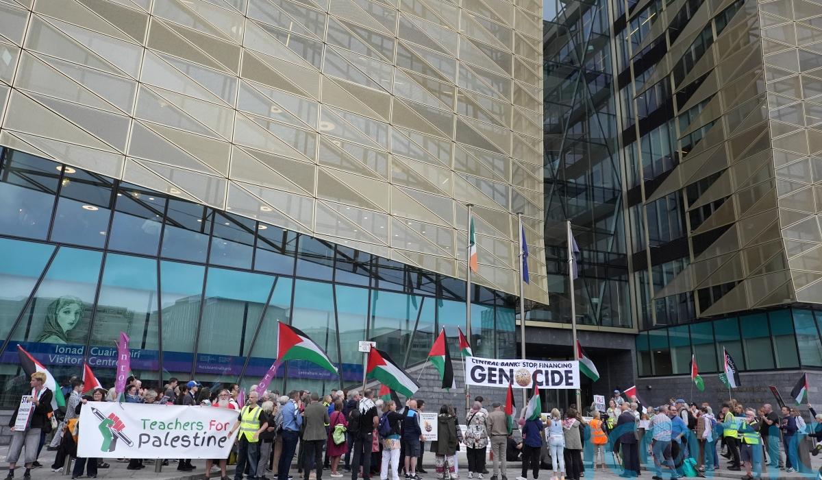 Around 100 demonstrators gathered outside the Central Bank in Dublin on Tuesday to demand an end to the authority’s role in approving Israel bonds for sale in the EU, for the Government to include services in the Occupied Territories Bill and to pass that legislation.