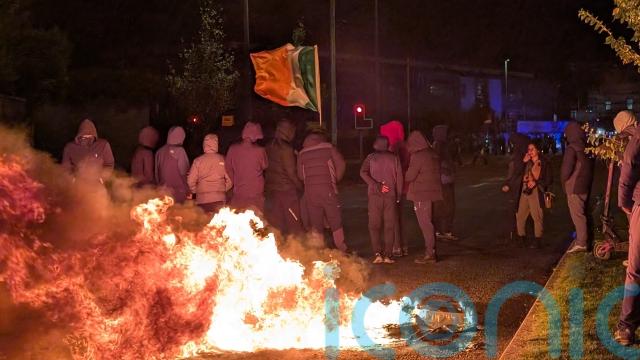 A police vehicle was also set on fire as a large crowd gathered at the Citywest Hotel on Tuesday evening.