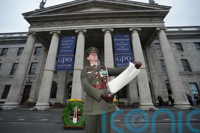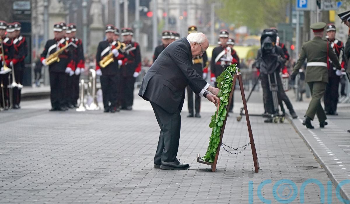 Irish President Michael D Higgins led the commemorations of the Easter Rising in a military ceremony outside the GPO on O’Connell Street in the capital, one of the main sites of the rebellion against British rule in 1916.