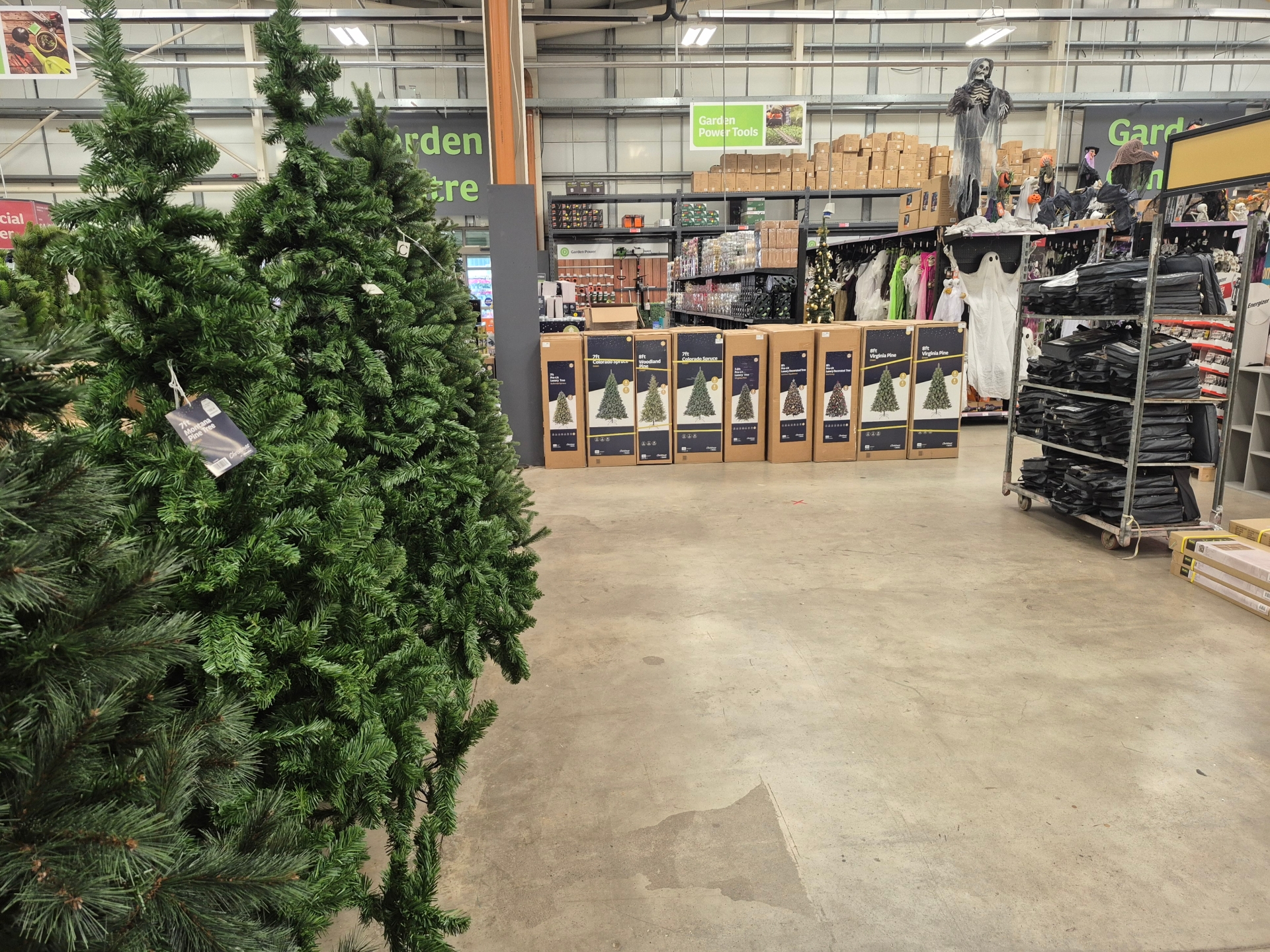The image shows Christmas stock displayed with trees on the floor, some complete with lights, for sale beside skulls and ghost decorations and Halloween stock.