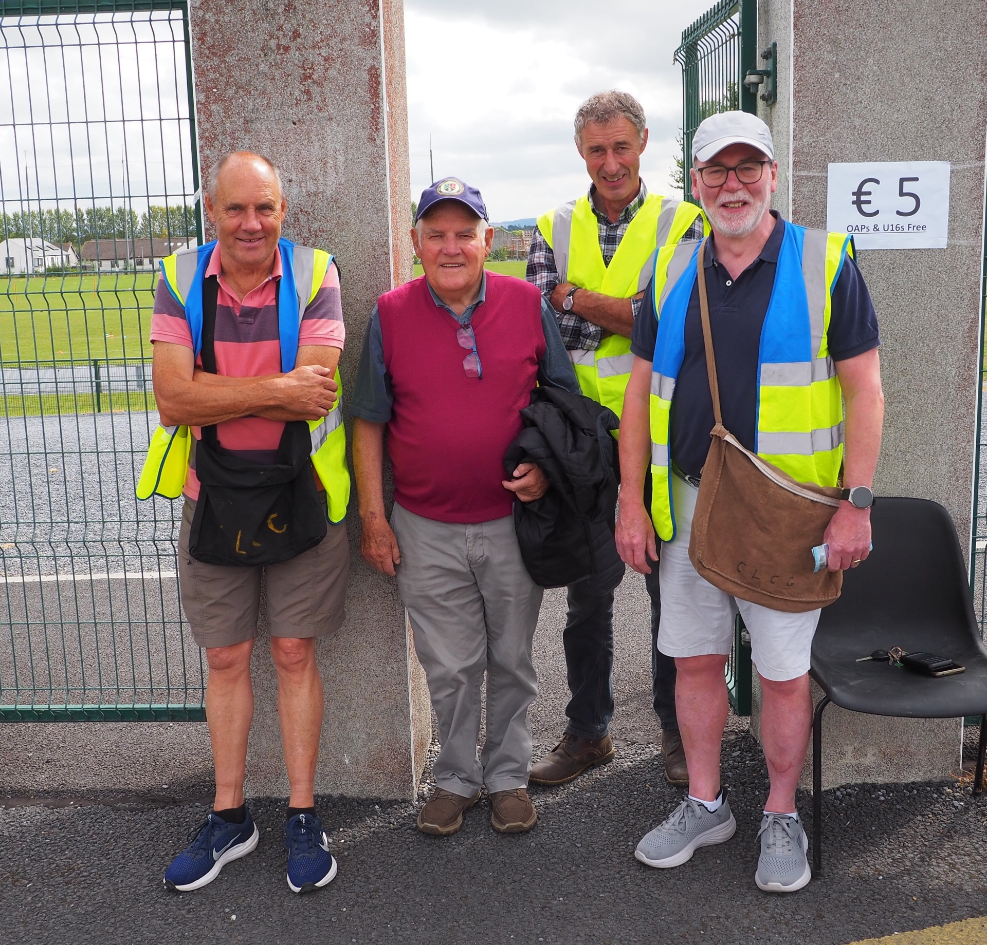 Fan Larkin with John Locke's officers John Walker (President), Jim Lynch (Chairperson), Paddy Kerwick (Treasurer) before the James Stephens and Dunnamaggin game at John Locke Park