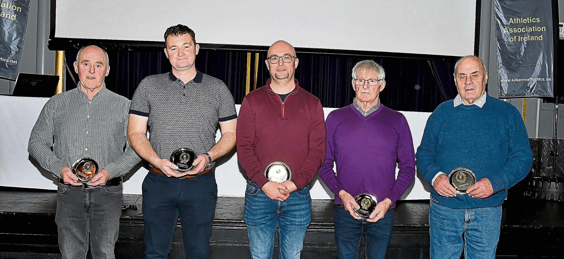 Brow Rangers athletes Joe Kelly, Sean Maher, Kieran Kelly, Murty Kelly and Tom Power receiving their Championship Best Performance awards at the Kilkenny AAI Awards, which were held in the Set Theatre. Pictures: Willie Dempsey